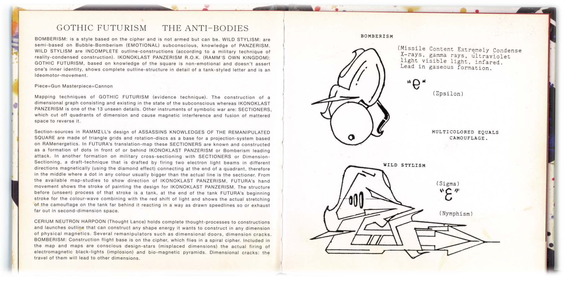 The raw urbanism portrayed through these disciplines, in conjunction with his mythology, transcends and ascends all craw that have indulged and performed “FUTURES”. In other words, this “MECHANIC”, (THE RAMMELLZEE) constructs art in formation of his own government. Each work of art expressed hereafter is to be recognized as currency, issued and signed by the artist to be evidence of his own Treasury’s. As such, said currency maintains a war department for its own protection.