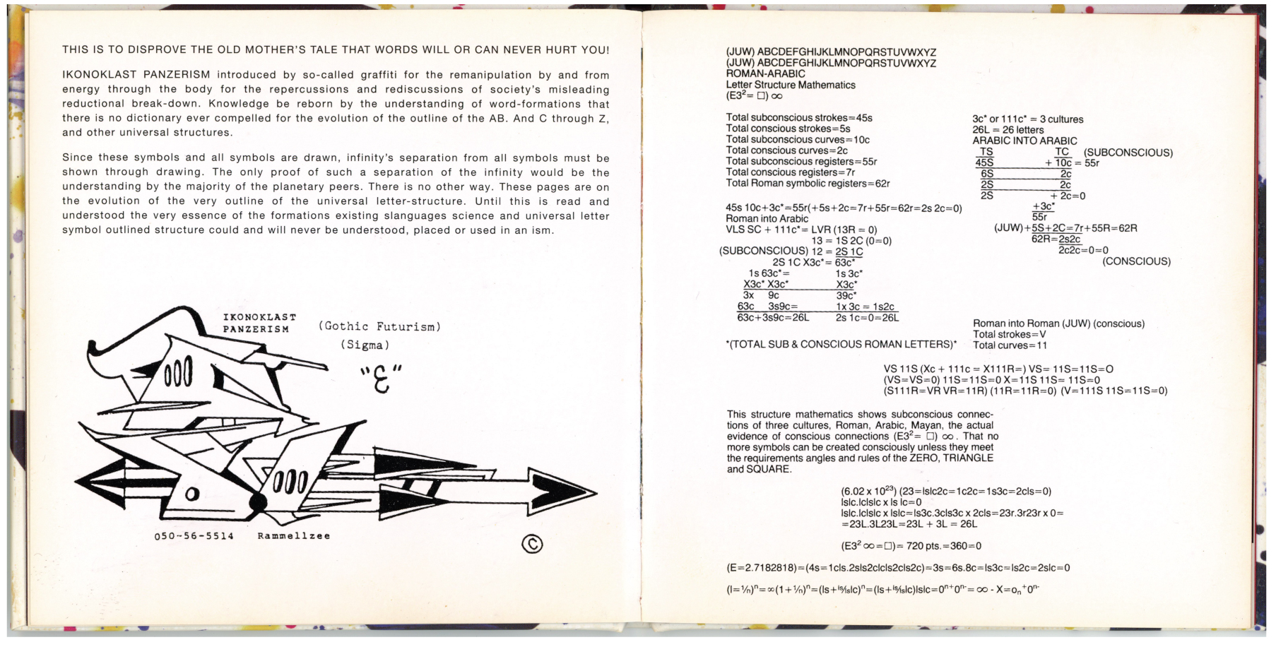 An artform based upon the study of the dictionary’s language tree combined with “Grimm’s Law.” Through the form of “INTELLECTUAL HORRORS”, it describes prophecies of the “Microcosmic” and “Macrocosmic”, in addition to “Ikonoklast Letter Racerism”, (TANKS) which are illuminations that acronautically and acrodynamically weapon-slave the alphabet. The alternative flying of the letter, as opposed to a traditional phonetic utility, renders it neutral essence rather than the common usage as an accessory to human existence, whereas speech is not accessorial to the basic humans passion for conception.